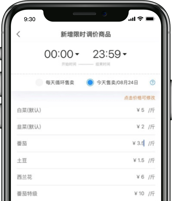 限时促销、短保商品可随时调价批量改价即时生效,多端同时同步电子价签实时触达,售价想调就调,例如晚上19点7折、20点6折、21点5折,远程可调,无需定点!