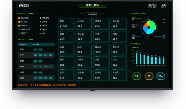 数据大屏实时连接监管、市场、菜贩各方清楚掌握菜价、交易等经营信息