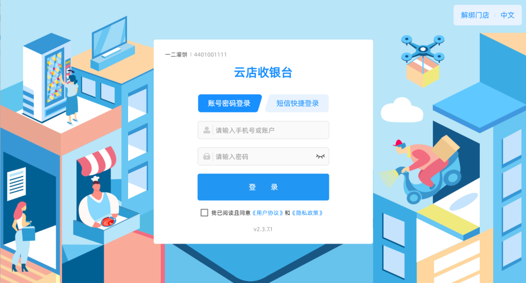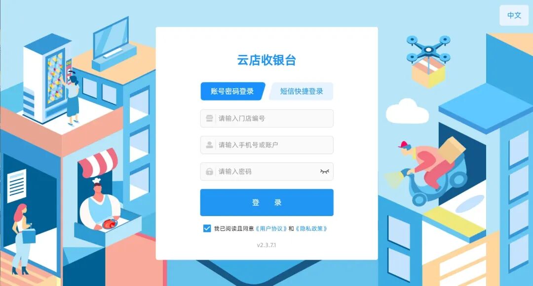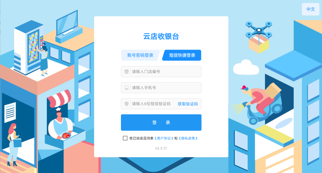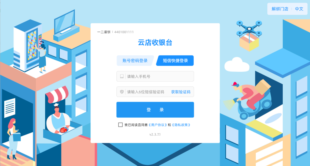 以下为首次通过门店编号+手机号+短信验证码登录云店收银台页面: