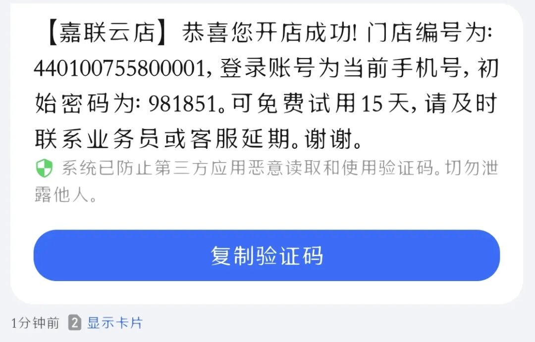 短信内容:【嘉联云店】恭喜您开店成功!门店编号为:XXXX,登录账号为当前手机号,初始密码为:XXXXXX。可免费试用**天,请及时联系业务员或客服延期。谢谢。