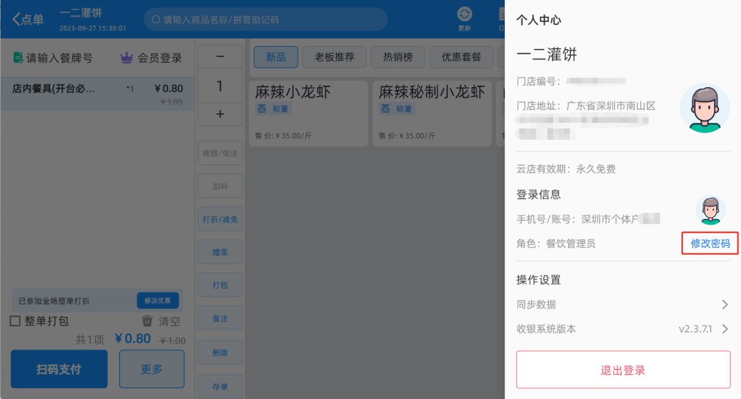以下为修改云店收银台登录密码操作入口示意图: