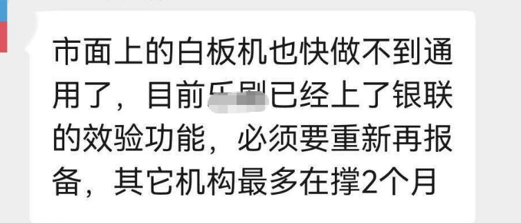 有消息称,白板机禁止入网的截止日期为10月17日,在10月17日下午5点前生产的白板机,仍可按照白板机状态进行入库操作。此后,白板机将无法再以“白板状态”直接出厂,必须先入库到支付公司,之后才能出厂,而且若要切换支付通道,还需得到原支付公司的许可才行。